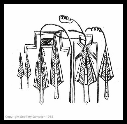 One of my interests is in the intersection between images and prose.  The note [on Proto-Graphical Syntax] is prescient.  It echoes a semasiographic image that has been discussed recently on the web.  The image below shows two houses, and the tree shapes represent people.
