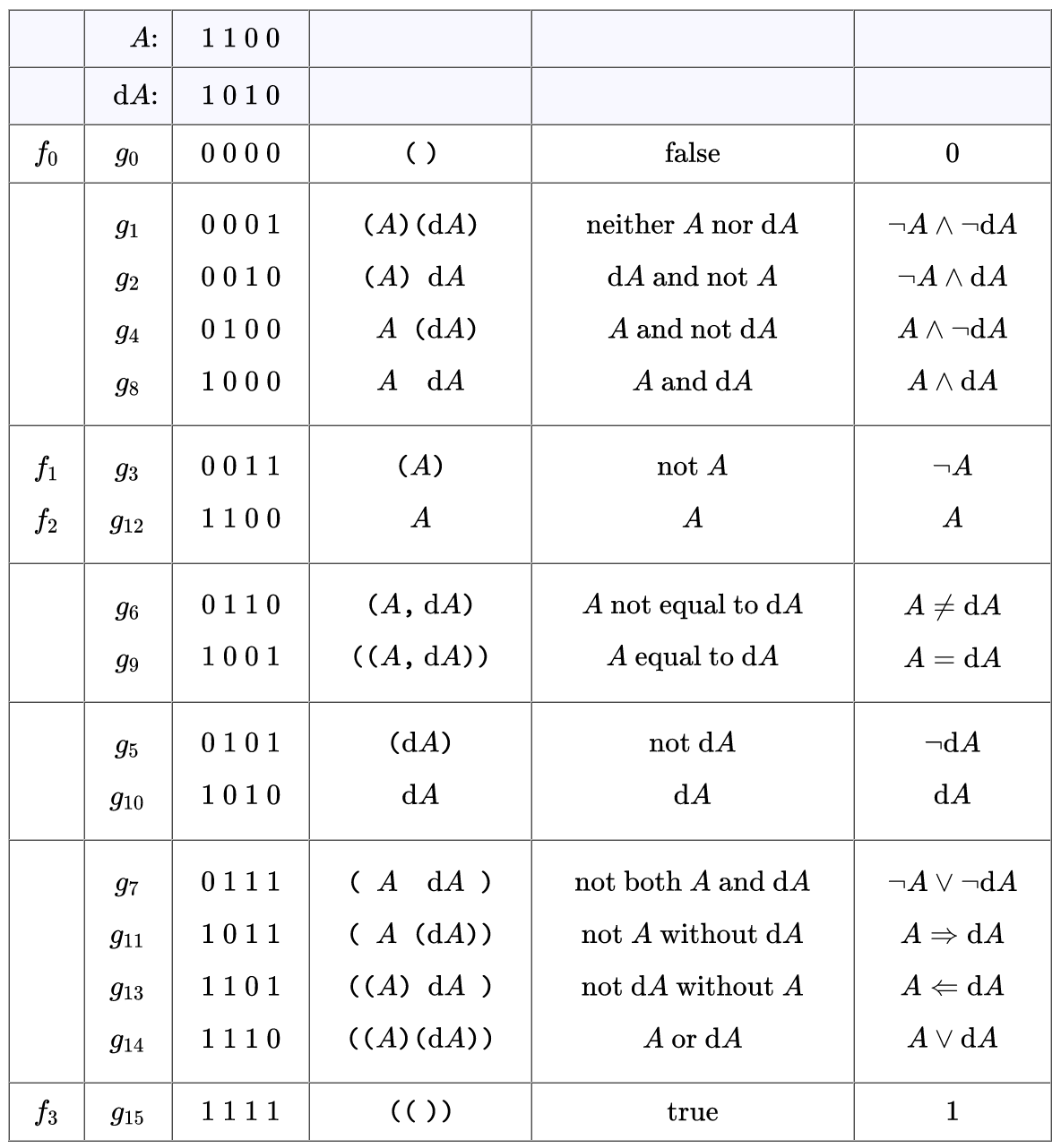 In viewing the previous Table of Differential Propositions it is important to notice the subtle distinction in type between a function and its inclusion as a function